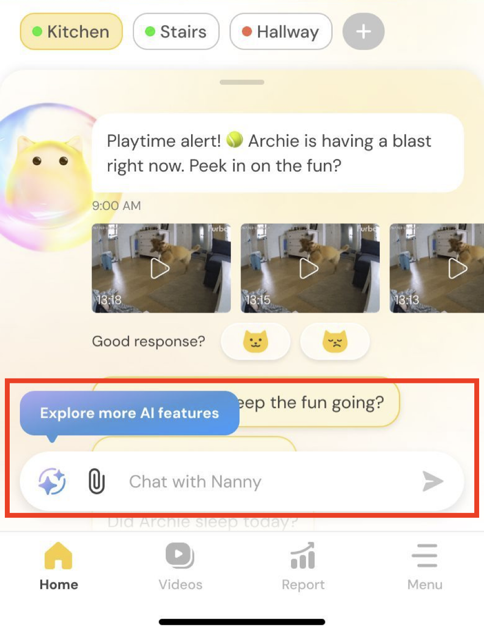 Instant Update gives you a summary of your pet’s activity through Nanny Chat, including video clips and insights tailored to how long it’s been since your last check-in.