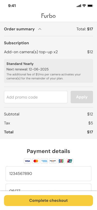 - Add Cameras to your subscription to add your existing Furbo Camera