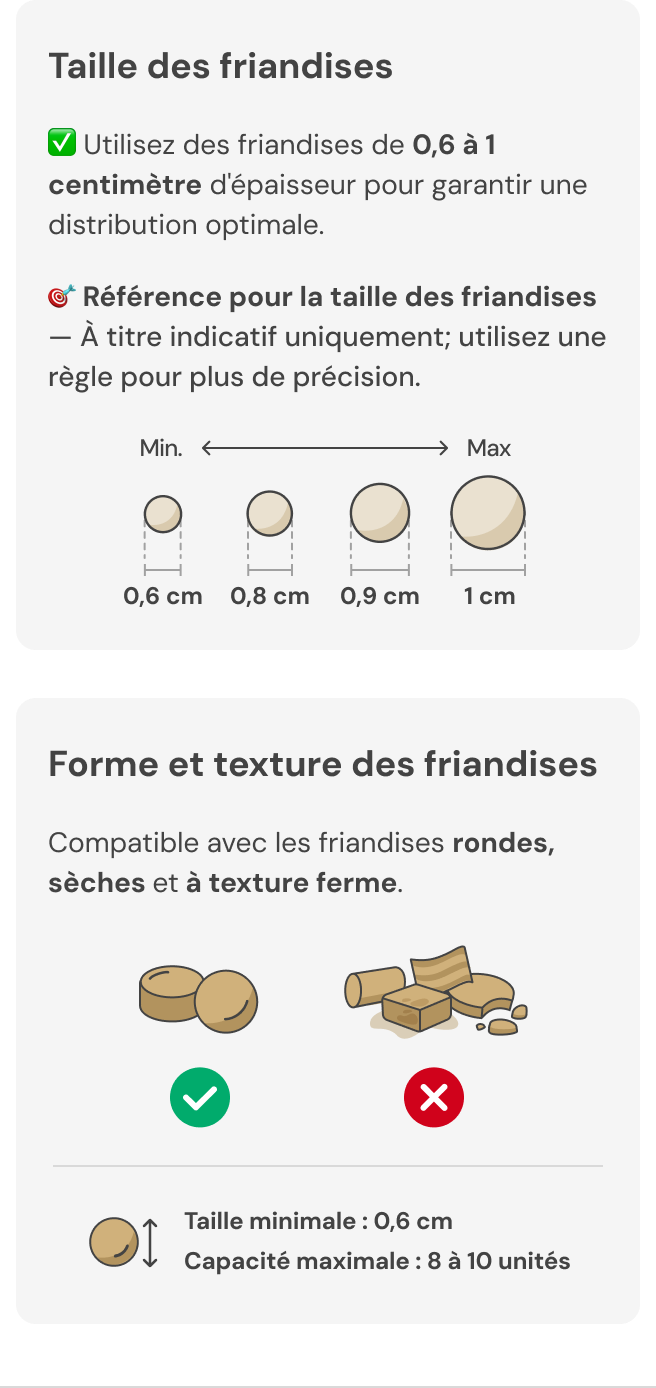 | Consultez le guide des friandises pour connaître les friandises adaptées. Insérez-les verticalement, une à la fois. |
