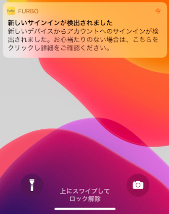 二段階認証機能が無効にされている状態で、あなたのFurboアカウントに新しいデバイス(スマートフォン)からのログインがある場合、このような通知が表示されます。