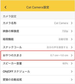 ホーム画面の右下にある「メニュー」→「カメラ名」→「おやつの大きさ」