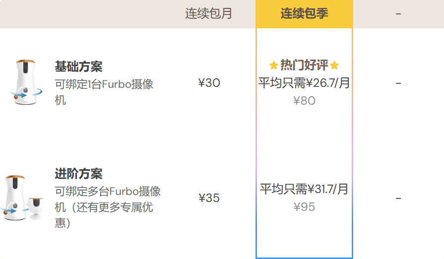 透过爱宠会员优享套餐方案,即可以超值的价格获得一台全新的 Furbo 宠物摄像机-360 度版,以及一整季的爱宠管家服务功能。