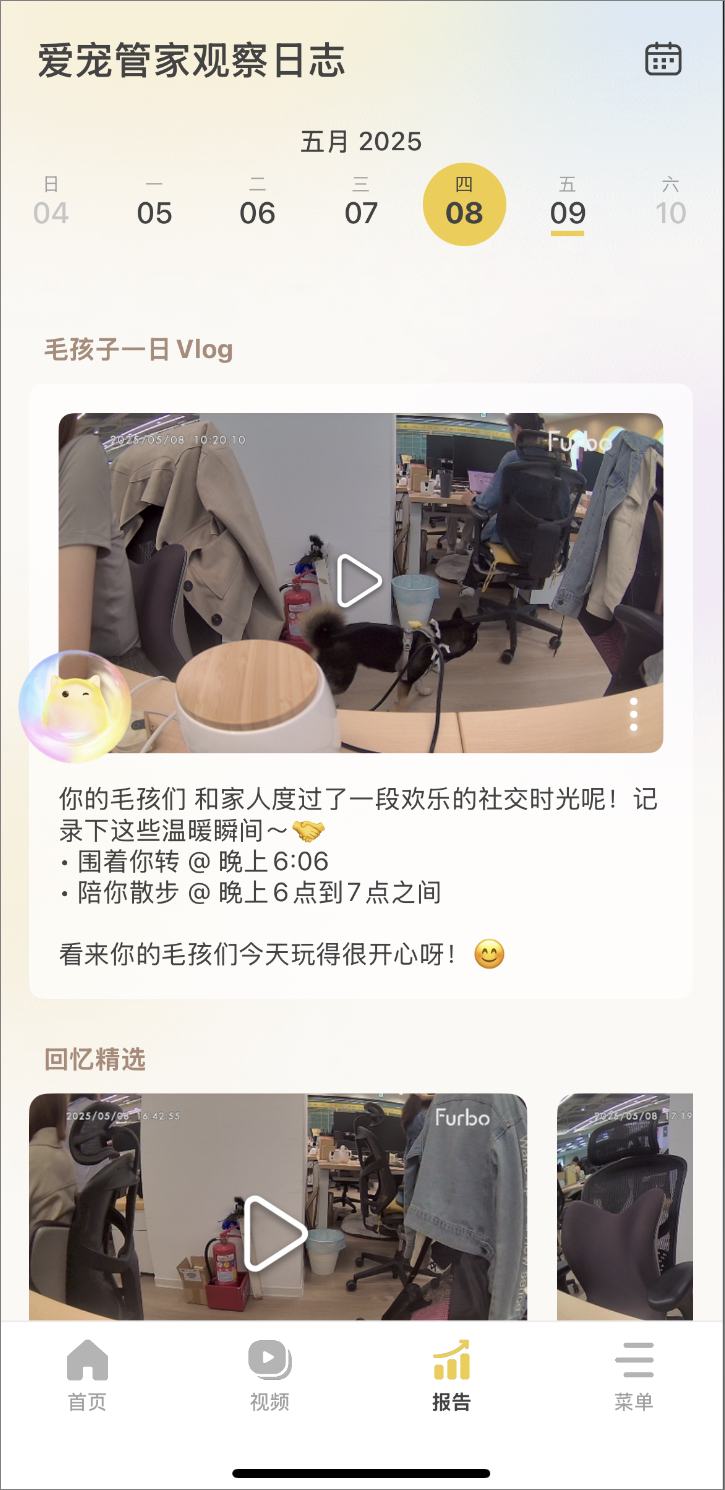 这样的设计是为了确保摘要内容来源于 Furbo 摄像头的最新数据,让您掌握宠物最真实的活动情况!