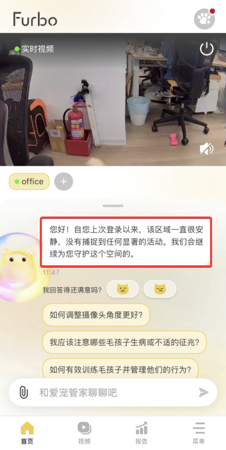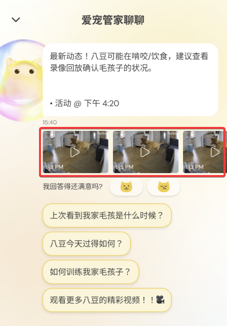 “实时更新”会通过爱宠管家聊聊,根据您最后查看的时间,提供毛孩的活动摘要、录像回放片段与专属建议。