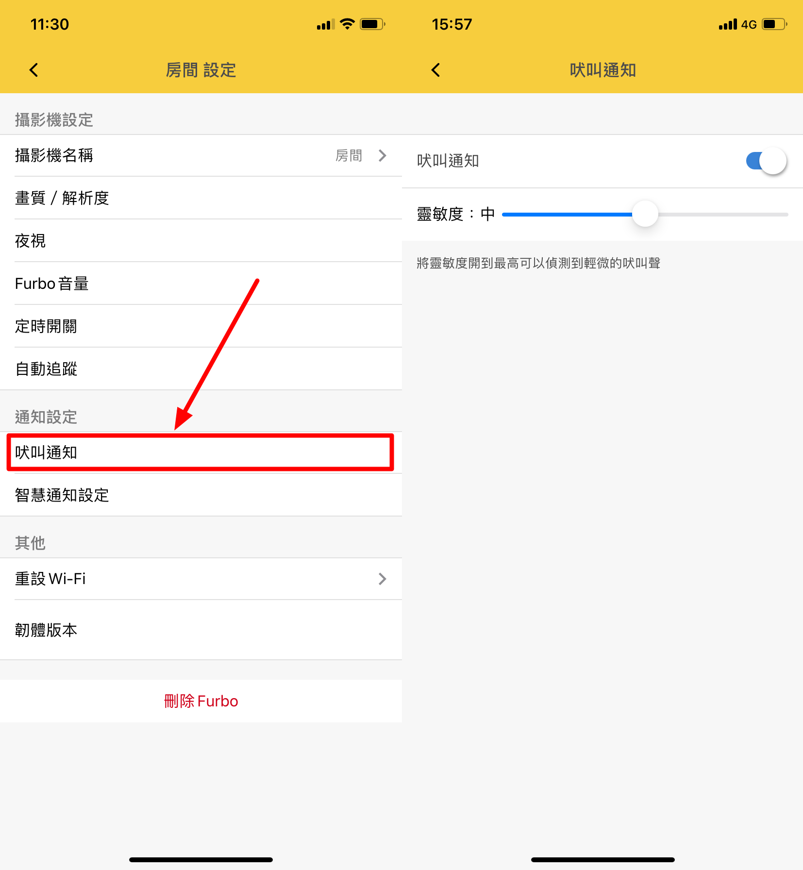 通知設定中,點選【吠叫通知】,將圓點向右為開啟吠叫通知;靈敏度滑桿向右,靈敏度越高