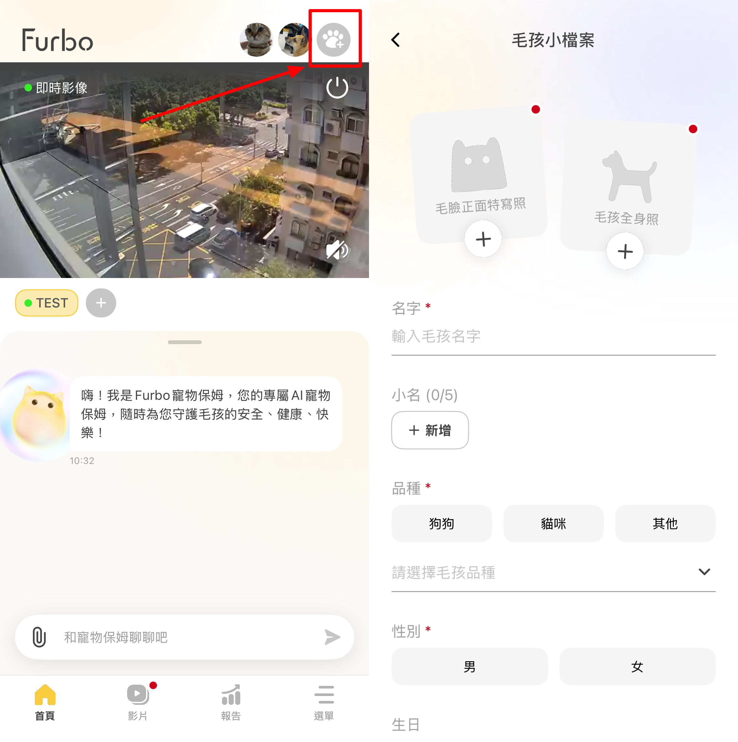 Furbo 支援服務 Furbo 貓咪攝影機-360 度版 功能設定 寵物資訊設定 家長們可以在 Furbo App 建立專屬家中寶貝的寵物檔案!「寵物資訊」的設定方式首頁上方點選【灰色加號】的圖示進入後,即可輸入貓貓的基本資料 填寫完成後,按下頁面底部的【儲存】以保存設定 【 Furbo 小教室】最多設定 5 個寵物資訊如果有任何需要客服協助的地方,請點以下線上交談的按鈕與我們聯繫。 線上交談 關於 360 profile setting product_feature